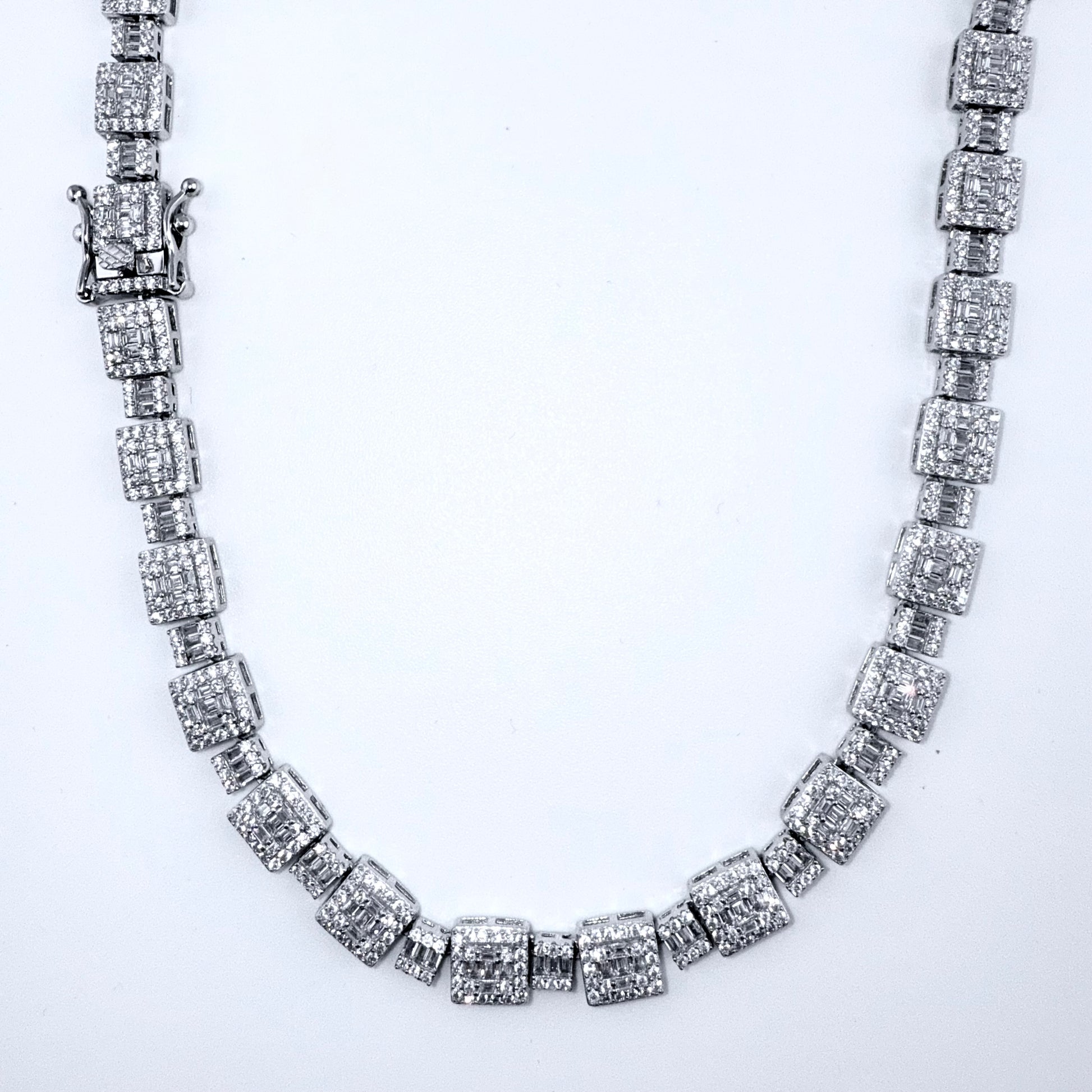 Turn heads with this bold and brilliant iced-out sterling silver chain necklace, designed for those who demand both style and durability. Crafted from premium 925 sterling silver and finished with a sleek rhodium plating, this chain delivers a lasting shine that won’t fade or tarnish over time.