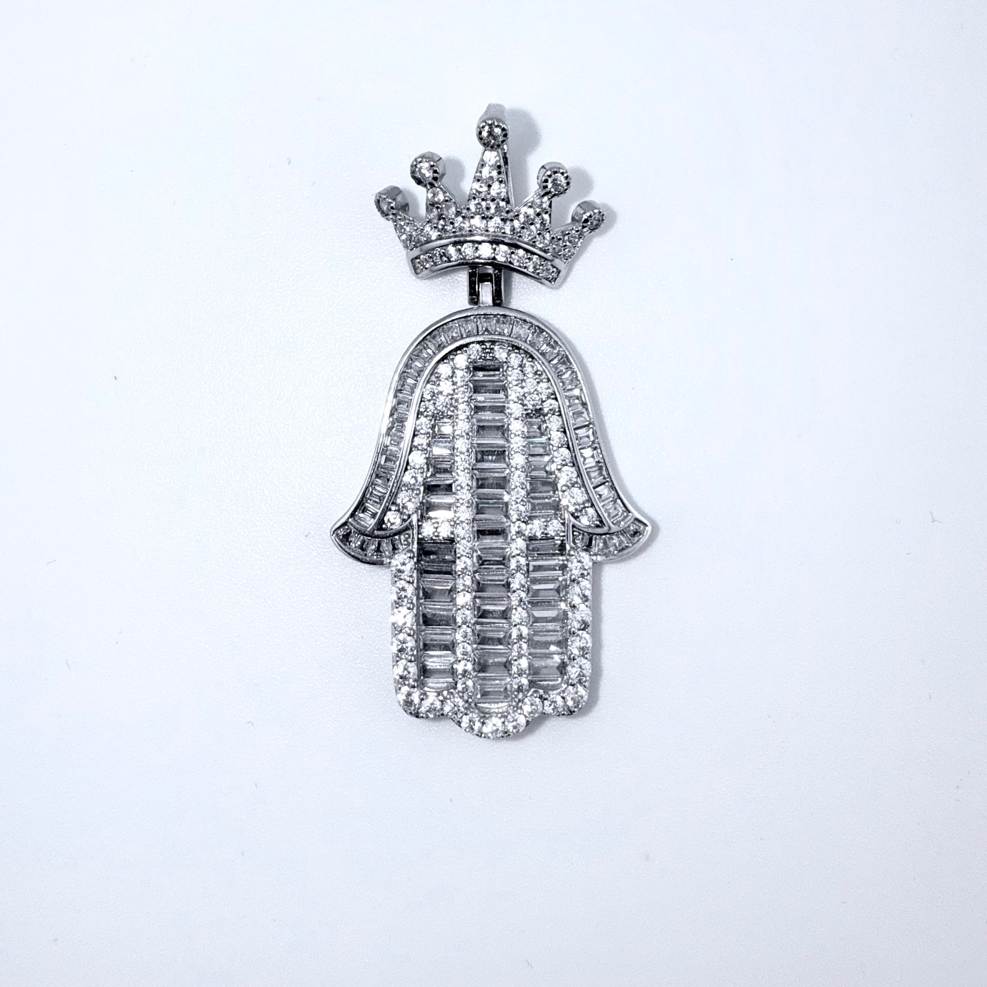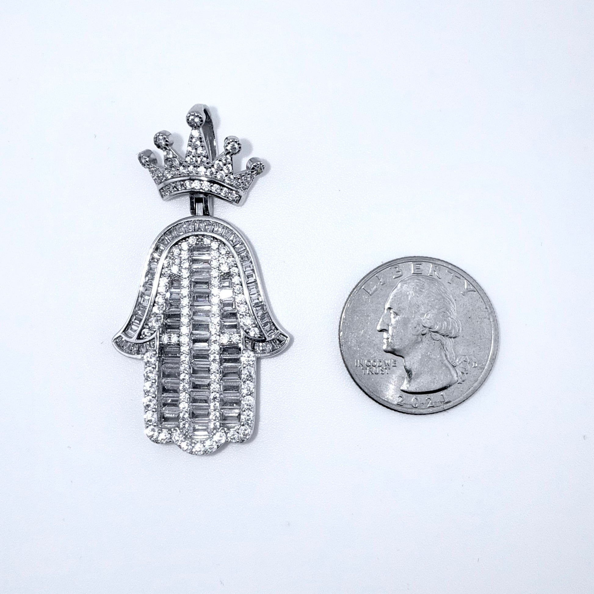 Real 925 Sterling Silver CZ Crown Hamsa Hand Pendant